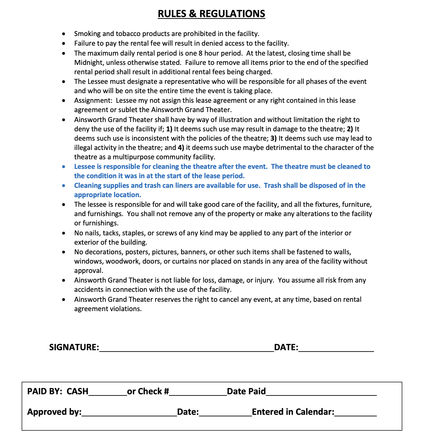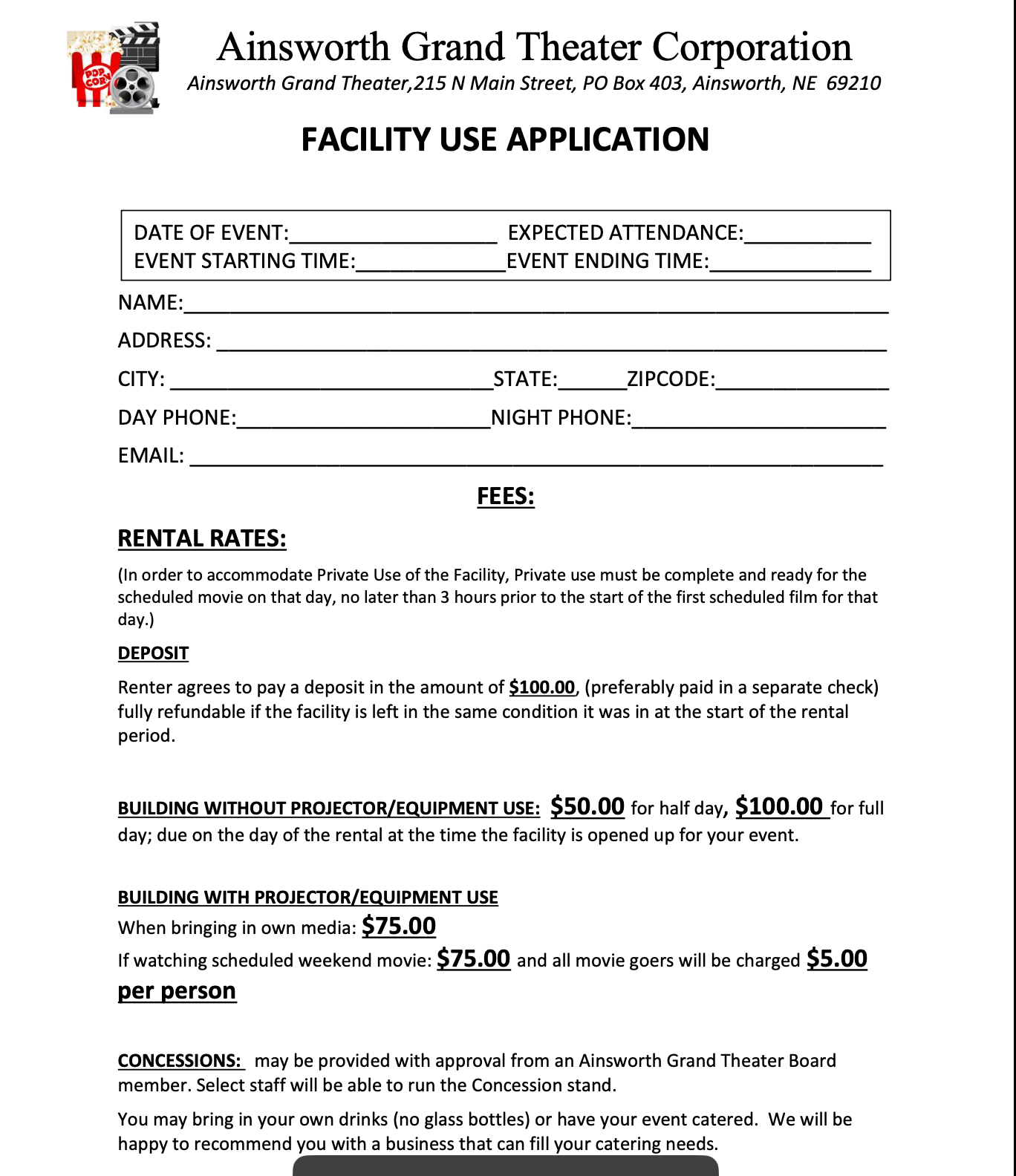 Theater Rental:Need a place to host an event? Consider renting the Ainsworth Grand Theater. Fill out and return completed form with payment to Dori Gracey. Questions, call Dori at 402-382-8201